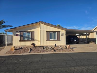 Located at space #91, this completely furnished 1999 Hallmark manufactured home offers approximately 1,188 sq. ft. of comfortable living with 2 bedrooms and 2 bathrooms. The home includes linens and kitchen items and features updated flooring, an island kitchen, and a finished Arizona room. Additional highlights include a washer and dryer, a laundry room with a utility sink, a step-in shower, and double awnings. Recent upgrades include new exterior paint, a new air conditioner installed in 2023, and a new roof replaced in 2023. Desert landscaping completes this well-maintained home in the Fairways 55+ active adult community.